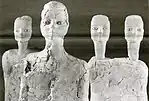 Dès la période néolithique en Jordanie, des figurines et des sculptures ont été réalisées. Dans certains des exemples les plus anciens, des crânes humains étaient construits avec du plâtre et des incrustations étaient utilisées pour les orbites[13]. Deux caches de figurines découvertes à 'Ain Ghazal, près d'Amman, comprennent des modèles d'animaux et quelque trois douzaines de figurines monumentales, dont les chercheurs pensent qu'elles étaient importantes pour le rituel et la structure sociale des peuples qui vivaient là[14], et qu'elles pouvaient faire partie d'un rituel funéraire[15]. Les statues de 'Ain Ghazal sont grandes, certaines mesurant environ un mètre de haut. Ain Ghazal a été occupée entre 7000 et 5000 avant J.-C. et les statues ont été datées d'environ 6500 avant J.-C.[15]. Faisant un usage intensif du plâtre[16], les statues d'Ain Ghazal se démarquent nettement des minuscules figures sans visage de la période paléolithique et marquent l'avènement d'un art néolithique distinct[15].
