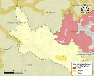 Le retrait-gonflement des sols argileux est susceptible d'engendrer des dommages importants aux bâtiments en cas d’alternance de périodes de sécheresse et de pluie. 5,8 % de la superficie communale est en aléa moyen ou fort (19,2 % au niveau départemental et 48,5 % au niveau national). Sur les 64 bâtiments dénombrés sur la commune en 2019, 6 sont en aléa moyen ou fort, soit 9 %, à comparer aux 17 % au niveau départemental et 54 % au niveau national. Une cartographie de l'exposition du territoire national au retrait gonflement des sols argileux est disponible sur le site du BRGM[21],[Carte 2].