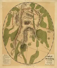 - Sans doute absorbé par les combats qu'il voit se dérouler en contrebas, Fremantle oublie de noter que Gettysburg est un carrefour de grand-routes : Baltimore est à 52 miles (84 km), Washington à seulement 90 miles (145 km) vers le sud-est, et New York à 266 miles (367 km) vers le nord-est) - et qu'un chantier de construction d'une voie de chemin de fer est-ouest est en cours. Il rapportera pourtant la forte résistance d'une unité nordiste dans la tranchée du chemin de fer, le 1er juillet