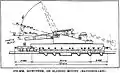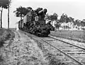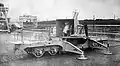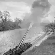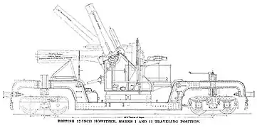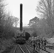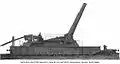 - Affût truck à glissement : le canon est solidaire du châssis et le recul est atténué par le frottement de pièces de bois contre les rails de la voie de chemin de fer. La direction de tir est réglée par le positionnement sur un épi courbe de voie ferrée, construit pour l'occasion.