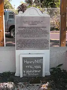 Henri Nott, né en 1774, n’a que vingt-trois ans lorsqu’il débarque à Tahiti pour évangéliser les Polynésiens. Il mit dix-huit ans à traduire la Bible en tahitien dont l’arrivée est fêtée le 5 mars de chaque année. C’est lui qui convertit et baptisa le roi Pōmare II, en 1819, dans une immense chapelle protestante située à Arue. Il devient également le confident et le conseiller du fameux roi.