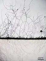 | En condition de stress[4], des organes de reproduction asexuée (ou conidiophores) se développent, à partir du mycélium. Ils sont formés d'une tige filamenteuse portant les cellules conidiogènes, produisant des spores (ou conidies). Les espèces du genre Aspergillus sont caractérisées par un conidiophore possédant une extrémité renflée (ou vésicule). Cette vésicule terminale est sphérique (de 40 µm de diamètre) et porte des cellules conidiogènes fertiles (ou phialides), en forme de bouteille[5]. Les phialides sont disposées sur tout le pourtour de la vésicule et sont portées par une cellule stérile (ou métule) directement insérée sur la vésicule. Les conidiophores sont lisses, hyalins ou brunâtres dans la partie supérieure, très longs (de 1 à 3 mm). La tête aspergillaire est globuleuse et radiée, noire à maturité. |