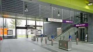 La station aérienne dispose, au niveau du sol, d'un hall à l'ouest, avec deux accès et un hall à l'est avec deux accès et un ascenseur pour la relation avec le quai situé au-dessus, permettant l'accessibilité aux personnes à la mobilité réduite.