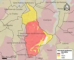 Le retrait-gonflement des sols argileux est susceptible d'engendrer des dommages importants aux bâtiments en cas d’alternance de périodes de sécheresse et de pluie. 96,8 % de la superficie communale est en aléa moyen ou fort (59,3 % au niveau départemental et 48,5 % au niveau national). Sur les 630 bâtiments dénombrés sur la commune en 2019, 630 sont en aléa moyen ou fort, soit 100 %, à comparer aux 85 % au niveau départemental et 54 % au niveau national. Une cartographie de l'exposition du territoire national au retrait gonflement des sols argileux est disponible sur le site du BRGM[21],[Carte 2].