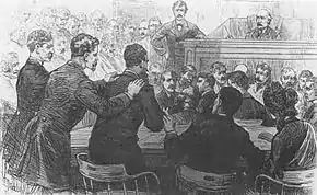 Le procès débute le [39]. Le tribunal est présidé par le juge Walter Cox et le jury est constitué de douze hommes : un restaurateur, un homme d'affaires à la retraite, un machiniste, deux plâtriers, un sidérurgiste, deux épiciers, un marchand de cigares et trois commerçants[39]. Représenté par son beau-frère, George Scolville et un jeune avocat de Washington, Leigh Robinson[39], Guiteau devient la coqueluche des médias, en raison de son comportement étrange. Il houspille constamment ses défenseurs, témoigne sous forme de poèmes épiques qu'il récite à longueur d'audience, et sollicite des avis de droit de la part du public, en lui faisant passer des notes. Il dicte une autobiographie au New York Herald, qu'il termine par une annonce matrimoniale pour une jolie chrétienne de moins de trente ans. Il est parfaitement conscient de l'indignation et la haine qu'il inspire à l'opinion publique américaine, surtout après que l'on tentât par deux fois d'attenter à sa vie. Il affirme ne pas être coupable, car l'assassinat de Garfield est la volonté de Dieu et qu'il n'a été qu'un instrument de celle-ci[40]. Une autre fois, il fait valoir que Garfield a été tué, non par lui-même, mais par une série d'erreurs médicales : « Les médecins ont tué Garfield, je n'ai fait que de tirer sur lui. » Tout au long du procès et jusqu'à son exécution, Guiteau est interné au St. Elizabeths Hospital dans le quartier sud-est de Washington.