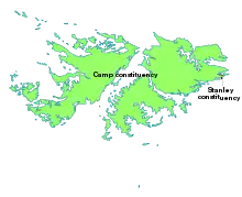 L'assemblée législative est composée de 11 membres dont 8 élus pour 4 ans selon un mode de scrutin plurinominal majoritaire dans 2 circonscriptions de 5 et 3 sièges chacune, correspondant à la capitale, Stanley et au reste du territoire, dit Camp. Les habitants votent pour autant de candidats qu'il y a de sièges dans leur circonscription, et ceux ayant réunis le plus de suffrage sont déclarés élus. À ces 8 membres élus s'ajoutent les membres du Conseil exécutif, qui siègent mais n'ont pas le droit de vote.