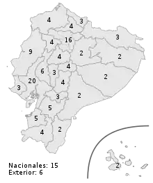 Sur ce total, 116 sièges sont pourvus au scrutin proportionnel plurinominal avec listes ouvertes dans 31 circonscriptions de 2 à 6 sièges appelés districts. Chacune des 24 provinces correspond à un district à l'exception des trois plus peuplées — Guayas, Pichincha et Manabí —, qui sont subdivisées en plusieurs districts : quatre pour les provinces du Guayas et du Pichincha, deux pour la province du Manabí. Le nombre de sièges par province varie ainsi entre 2 pour les provinces les moins peuplées et 20 pour celle du Guayas. Après décompte des suffrages, les sièges sont répartis à la proportionnelle dans chaque district selon la méthode d'Hondt. À ces sièges s'ajoutent 15 autres également pourvus au scrutin proportionnel plurinominal dans une unique circonscription nationale, répartis selon la méthode de Sainte-Laguë. Enfin, 6 sièges réservés à la diaspora des Équatoriens vivant à l'étranger sont pourvus dans trois circonscriptions de deux sièges chacune au scrutin majoritaire plurinominal. Les électeurs disposent de deux voix qu'ils attribuent à raison d'une voix par candidats. Après décompte des suffrages, les deux candidats arrivés en tête dans chaque circonscription sont élus[1].