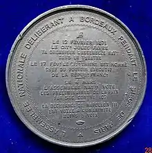 À la suite de la défaite française de Sedan, durant la guerre franco-allemande de 1870, les conditions de l'armistice signé le à Versailles par Jules Favre au nom du Gouvernement de la Défense nationale, prévoient la convocation d'une assemblée nationale, seule capable de ratifier un traité de paix entre la France vaincue et son vainqueur le nouvel Empire allemand.