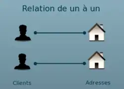 Dans une table principale contenant les clients, et une table secondaire contenant l'adresse de ces clients, une seule adresse pourra correspondre à un seul client et un seul client pourra correspondre à aucune ou une seule adresse.