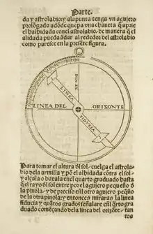 En 1545, Martín Cortés de Albacar écrit Le premier ouvrage consacré en partie à l'astrolabe nautique. Imprimé en 1551 il y représente un instrument, réduit au minimum, constitué d'un disque plein avec une alidade où chacune des deux pinnules sont percées de deux œilletons différents : l'un, de petit diamètre, pour prendre la hauteur du Soleil, l'autre, de plus grande ouverture pour viser les étoiles ; ce serait la première description et le premier mode de construction imprimés de l'astrolabe nautique[23].