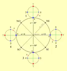 En 1471 au plus tôt[10], l'équateur est franchi et l'étoile Polaire disparait à l'horizon. Il faut donc mettre en œuvre une autre méthode pour déterminer la latitude. Ce sera par l'intermédiaire de la mesure de la hauteur méridienne du Soleil. Déjà testée au cadran de navigation par Diogo Gomes sur les côtes de Guinée en 1460-1462 ; le résultat est décevant, l'instrument n'est pas adapté à la « pesée du Soleil » (environ 5° d'écart), et l'exploitation des tables astronomiques existantes[N 6] pour en déduire la latitude est difficile[11]. Il lui sera préféré l'astrolabe qui apparait dans les années 1481[12] et dont la première mention est le fait de Christophe Colomb qui relate son utilisation par Bartolomeu Dias vers le Cap de Bonne-Espérance en 1488 (voir infra).