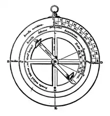 L'astrolabe nautique est probablement inspiré de l'astrolabe planisphérique[1] dont il conserve la forme générale mais, comme il sert à déterminer la latitude, il ne possède ni tympans ni araignée[N 1]. L'astrolabe nautique ne comprend donc que deux pièces principales, l'astrolabe proprement dit[N 2] et l'alidade qui doivent assurer la seule fonction d'usage de l'instrument : mesurer une hauteur méridienne du Soleil, ce qui, en langage maritime, s'appelle « peser le Soleil ».