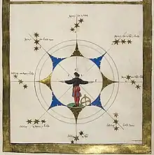 Les Regimento do Norte compris dans le « régiment de Munich » sont datés de 1509, mais ils auraient pu apparaitre sous forme manuscrite dès les années 1455. Ils indiquent la correction à apporter à la hauteur relevée de l'étoile Polaire pour avoir la latitude ou hauteur du pôle[16]. Ceci suivant les huit principales positions cardinales de la petite Ourse autour du pôle : Nord, Sud, Est, Ouest et les quatre positions intermédiaires. Pour imager le propos, une roue sera proposée : la Roue Pôle Homme ; un personnage imaginaire les bras en croix présente les points cardinaux et la configuration des étoiles de la petite Ourse choisies pour repérage. Il s'agit le plus souvent des positions des « Gardes », soit β et γ, Kochab et Pherkad.