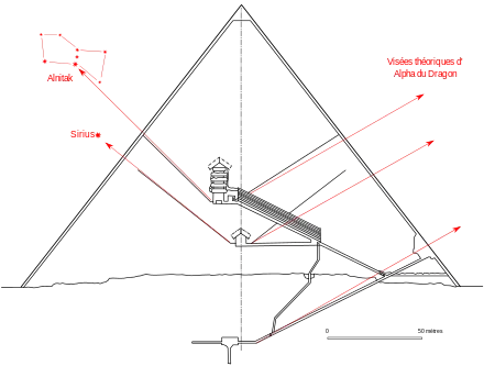 L'entrée de toutes les pyramides était située sur la face nord (à l'exception de la pyramide rhomboïdale du pharaon Snéfrou à Dahchour qui possède une seconde entrée à l'ouest). Cette entrée permettait à l'âme du défunt de s'orienter vers la région polaire du ciel. Les Égyptiens nommaient d'ailleurs les étoiles circumpolaires, les impérissables, puisque celles-ci restaient visibles toute la nuit, ne descendant jamais sous l'horizon.