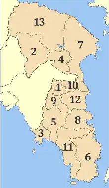 | Dème | Nom grec | Siège (si différent) | District municipal | Siège (si différent) | YPES code |