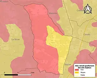 Le retrait-gonflement des sols argileux est susceptible d'engendrer des dommages importants aux bâtiments en cas d’alternance de périodes de sécheresse et de pluie. La totalité de la commune est en aléa moyen ou fort (67,4 % au niveau départemental et 48,5 % au niveau national). Sur les 126 bâtiments dénombrés sur la commune en 2019, 126 sont en aléa moyen ou fort, soit 100 %, à comparer aux 84 % au niveau départemental et 54 % au niveau national. Une cartographie de l'exposition du territoire national au retrait gonflement des sols argileux est disponible sur le site du BRGM[22],[Carte 2].
