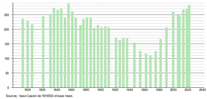 L'évolution du nombre d'habitants est connue à travers les recensements de la population effectués dans la commune depuis 1793. Pour les communes de moins de 10 000 habitants, une enquête de recensement portant sur toute la population est réalisée tous les cinq ans, les populations légales des années intermédiaires étant quant à elles estimées par interpolation ou extrapolation[29]. Pour la commune, le premier recensement exhaustif entrant dans le cadre du nouveau dispositif a été réalisé en 2008[30].