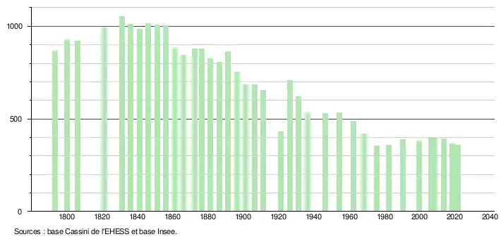 L'évolution du nombre d'habitants est connue à travers les recensements de la population effectués dans la commune depuis 1793. Pour les communes de moins de 10 000 habitants, une enquête de recensement portant sur toute la population est réalisée tous les cinq ans, les populations légales des années intermédiaires étant quant à elles estimées par interpolation ou extrapolation[18]. Pour la commune, le premier recensement exhaustif entrant dans le cadre du nouveau dispositif a été réalisé en 2008[19].