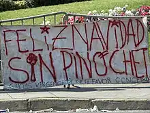 La dictature d'Augusto Pinochet est marquée par de multiples violations des droits de l'homme (plus de 3 200 morts et disparus, plus de 38 000 torturés[2], des dizaines de milliers d'arrestations de dissidents), lesquelles ont fait l'objet de trois rapports et de quatre procédures judiciaires dans les années 1990 et 2000, et ont entraîné l'exil de plusieurs centaines de milliers de Chiliens. La présidence de Pinochet est dénoncée dans son ensemble comme une période de dictature militaire, par de nombreux médias et ONG ainsi que par ses opposants[3],[4],[5],[6],[7],[8],[9],[10]. Elle est décrite comme telle par les historiens ; la qualification de dictature est également reprise par le rapport Valech, publié au Chili en 2004[11]. Ses partisans chiliens considèrent au contraire qu'il a « sauvé » le pays en l'empêchant d'adopter le communisme[12],[13].