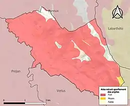 Le retrait-gonflement des sols argileux est susceptible d'engendrer des dommages importants aux bâtiments en cas d’alternance de périodes de sécheresse et de pluie. 92,6 % de la superficie communale est en aléa moyen ou fort (94,5 % au niveau départemental et 48,5 % au niveau national). Sur les 71 bâtiments dénombrés sur la commune en 2019, 70 sont en aléa moyen ou fort, soit 99 %, à comparer aux 93 % au niveau départemental et 54 % au niveau national. Une cartographie de l'exposition du territoire national au retrait gonflement des sols argileux est disponible sur le site du BRGM[22],[Carte 3].