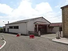 Le portail d'entrée comprenant une croix où est représenté le Sacré-Cœur de Jésus.
