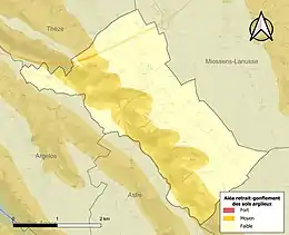 Le retrait-gonflement des sols argileux est susceptible d'engendrer des dommages importants aux bâtiments en cas d’alternance de périodes de sécheresse et de pluie[30]. 39,6 % de la superficie communale est en aléa moyen ou fort (59 % au niveau départemental et 48,5 % au niveau national)[Carte 3]. Depuis le , en application de la loi ELAN, différentes contraintes s'imposent aux vendeurs, maîtres d'ouvrages ou constructeurs de biens situés dans une zone classée en aléa moyen ou fort[Note 5],[31].
