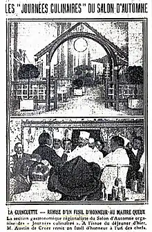 - Académie des inscriptions gastronomiques « le vaillant gastronome Augustin de Croze poursuit sa campagne contre les fléaux de la Table : fumeurs, danseurs, haut-parleurs et autres empêcheurs de manger tranquillement ». Une seule mention archivée. 1931 [37]