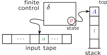 on dépile d'abord le symbole , puis on empile le mot , donc est remplacé par . Si le mot est vide, l'opération consiste donc simplement à dépiler ; si le mot commence par , donc si , l'opération revient à empiler, par-dessus , une autre mot . Un troisième avantage de cette notation compactée est que l'on peut tester quelle est la nature du symbole en haut de pile, simplement en le lisant et en le remettant.