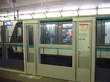 Les portes palières sont posées progressivement de nuit à partir de septembre 2008 dans les vingt-cinq stations de la ligne 1. Afin de permettre la compatibilité des portes palières avec les trains existants, la RATP a confié à la société ClearSy la conception, la livraison et l'installation d'un système de sécurité pour les 52 trains MP 89 de la ligne[20]. Les portes fonctionnent en relation avec l’arrivée et le départ des trains. Elles sont installées à raison de deux modules par nuit en semaine, en commençant par l’arrière des quais. Ces modules fonctionnent dès la reprise du service le matin suivant leur pose. Chaque quai nécessitant 18 portes, il faut donc entre trois et quatre semaines pour équiper une station complète.
