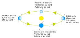 Lors de l'équinoxe, pour un bref moment, la terre dans son orbite présente au soleil son axe de rotation de façon que les deux pôles soient exposés exactement de la même façon, et donc la terre entière connaît ce jour-là une durée de jour et de nuit égale.