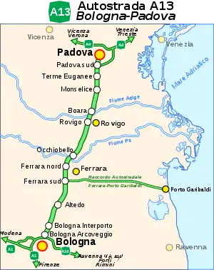 L'Autoroute italienne A13 relie Bologne et Padoue en passant par Ferrare et Rovigo. Elle est longue de 113 km. C'est la première autoroute sur laquelle on a essayé la signalisation anti-brouillard.