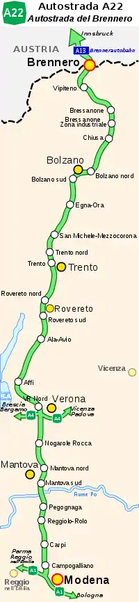 L'autoroute A22, également appelée autoroute du Brenner, raccorde le Brenner et Modène (Autoroute A1) à travers le Wipptal, la vallée de l'Isarco et la vallée de l'Adige. Longue de 314 km, elle se poursuit ensuite en territoire autrichien et devient l'autoroute A13. L'autoroute italienne du Brenner est exploitée par la Autostrada del Brennero SpA/Brennerautobahn AG, basée à Trente.