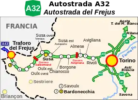 L'autoroute A32 ou autoroute du Fréjus relie Turin à Bardonnèche et à la France par le tunnel du Fréjus en Val de Suse. Son tracé total fait 72,4 km dont 19 en viaducs et 18 en tunnels.