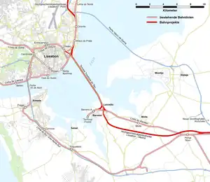 | Barreiro (Lavradio) - Lisbonne (troisième pont sur le Tage) | En projet |