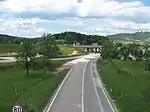 L'autoroute de la Fraternité et de l'Unité près d'Otočec, en Slovénie, à gauche dans son aspect original ( mars 2005) et à droite avec le viaduc de l'autoroute A2 (mars 2008) | ||