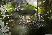 Femelle d'Autour à ventre blanc nourrissant ses poussins. F.Desmoulins.