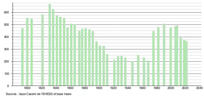 L'évolution du nombre d'habitants est connue à travers les recensements de la population effectués dans la commune depuis 1793. Pour les communes de moins de 10 000 habitants, une enquête de recensement portant sur toute la population est réalisée tous les cinq ans, les populations légales des années intermédiaires étant quant à elles estimées par interpolation ou extrapolation[16]. Pour la commune, le premier recensement exhaustif entrant dans le cadre du nouveau dispositif a été réalisé en 2008[17].