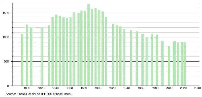 L'évolution du nombre d'habitants est connue à travers les recensements de la population effectués dans la commune depuis 1793. Pour les communes de moins de 10 000 habitants, une enquête de recensement portant sur toute la population est réalisée tous les cinq ans, les populations légales des années intermédiaires étant quant à elles estimées par interpolation ou extrapolation[28]. Pour la commune, le premier recensement exhaustif entrant dans le cadre du nouveau dispositif a été réalisé en 2007[29].