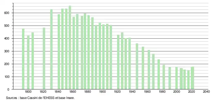 - Population municipale légale en vigueur au 1er janvier 2024, millésimée 2021, définie dans les limites territoriales en vigueur au 1er janvier 2023, date de référence statistique : 1er janvier 2021.
