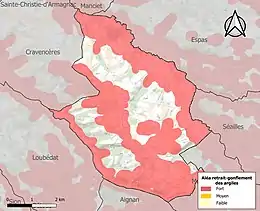 Le retrait-gonflement des sols argileux est susceptible d'engendrer des dommages importants aux bâtiments en cas d’alternance de périodes de sécheresse et de pluie. 65,6 % de la superficie communale est en aléa moyen ou fort (94,5 % au niveau départemental et 48,5 % au niveau national). Sur les 122 bâtiments dénombrés sur la commune en 2019, 93 sont en aléa moyen ou fort, soit 76 %, à comparer aux 93 % au niveau départemental et 54 % au niveau national. Une cartographie de l'exposition du territoire national au retrait gonflement des sols argileux est disponible sur le site du BRGM[25],[Carte 3].