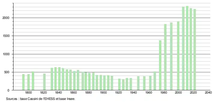 L'évolution du nombre d'habitants est connue à travers les recensements de la population effectués dans la commune depuis 1793. Pour les communes de moins de 10 000 habitants, une enquête de recensement portant sur toute la population est réalisée tous les cinq ans, les populations légales des années intermédiaires étant quant à elles estimées par interpolation ou extrapolation[25]. Pour la commune, le premier recensement exhaustif entrant dans le cadre du nouveau dispositif a été réalisé en 2006[26].