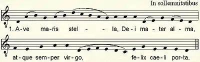 - Ave maris stella solemn tone (Schola Sanctæ Scholasticæ et Chœur de l'abbaye Sainte-Cécile, Royaume-Uni) : [écouter en ligne]