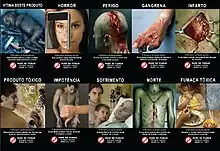 L'arrêté du 15 avril 2010[8] pris par le ministère de la Santé français imposait aux fabricants de tabac d'imprimer une image dissuasive sur au moins 40 % de la surface arrière du paquet. À compter du 20 avril 2011, tous les paquets distribués en débit de tabac ont dû se conformer à cette réglementation.