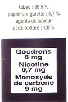 Les avertissements sur les paquets de cigarettes européens sont harmonisés. Ils doivent être inscrits en caractères gras, en noir sur fond blanc, entourés d'un cadre noir. L'avertissement doit occuper au moins 30 % de la surface du paquet sur l'avant, et 40 % sur l'arrière. Les quantités de nicotine, goudrons et monoxyde de carbone inhalés (pour un fumeur standard) doivent aussi être indiquées. La présence d'agents de texture, de conservateurs et d'arômes, sans autre précision, est également indiquée.