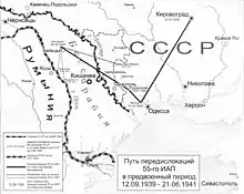 Le 21 juin, le quartier général et le quatrième escadron de la 77e escadre de chasse sont transférés à Bacău pour la prochaine "campagne de Russie", tandis que les cinquième et sixième escadrons de la 77e escadre de chasse sont transférés à Roman. A partir du 22 juin, le deuxième escadron de la 77e escadre est engagé dans la "campagne de Russie". Alors que la partie principale de la 77e escadre était basée à Focșani-Sud, la 77e escadre volait à partir de Siliștea[38] où étaient basés Heinkel He 111 de 2e escadron 2 de la 4e escadre[39]. Le 24 juin, le quatrième escadron de la 77e escadre de chasse a déménagé à Roman, et le reste de la 77e escadre a été rassemblé à Bacău. Le 12 juillet, l'ensemble du deuxième escadron de la 77e escadre de chasse est transféré à Iaşi, et le 13 juillet à Bălți. Après le début de l'attaque allemande sur le Dniestr le 17 juillet, le deuxième escadron de la 77e escadre fournit un soutien aérien au XIe Corps d'armée allemande au-dessus de la tête de pont du Dniestr entre Yaruha et Mohyliv-Podilskyï[14]. Le 12 juillet 1941, le IAP-55 soviétique a mené une attaque aérienne de l'aérodrome de Bălți à Singureni par les chasseurs et les bombardiers, connaissant bien la cible - la base aérienne de Bălți - où le IAP-55 était basé jusqu'en juillet 1941.