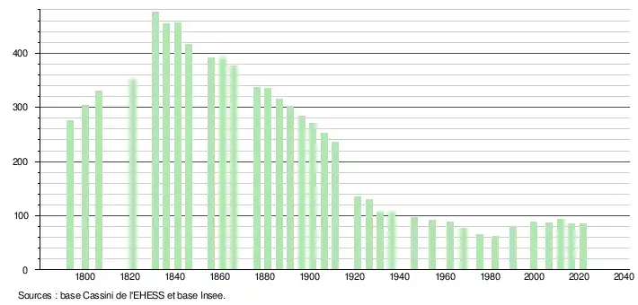 L'évolution du nombre d'habitants est connue à travers les recensements de la population effectués dans la commune depuis 1793. Pour les communes de moins de 10 000 habitants, une enquête de recensement portant sur toute la population est réalisée tous les cinq ans, les populations légales des années intermédiaires étant quant à elles estimées par interpolation ou extrapolation[20]. Pour la commune, le premier recensement exhaustif entrant dans le cadre du nouveau dispositif a été réalisé en 2006[21].
