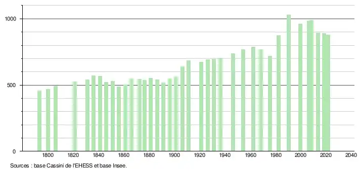 - Population municipale légale en vigueur au 1er janvier 2024, millésimée 2021, définie dans les limites territoriales en vigueur au 1er janvier 2023, date de référence statistique : 1er janvier 2021.