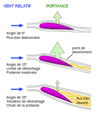 Plus l'angle formé entre l'aile et le vent relatif (angle appelé incidence) est important, plus les forces aérodynamiques sont grandes. Ceci reste vrai jusqu'à l'angle de décrochage, où la portance commence à décroître à cause du décollement des filets d'air au-dessus de l'aile (l'extrados).