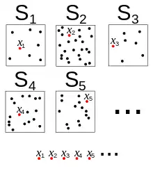 - Soit X un ensemble infini. Pour tout nombre naturel n, on pose An l'ensemble de tous les sous-ensembles de X à 2n éléments. Comme X est infini, chaque An possède au moins un élément. Une première application de ACω donne une suite (Bn) où chaque Bn est un sous-ensemble de X à 2n éléments.