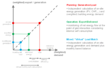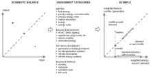 - La limite du système de construction est répartie en une limite physique qui détermine quelles ressources renouvelables sont considérées (par exemple dans l'empreinte énergétique des bâtiments, sur site ou même hors site[14]), respectivement combien de bâtiments sont inclus dans le solde (bâtiment unique, ensemble de bâtiments) et une limite d'équilibre qui détermine les utilisations énergétiques incluses (chauffage, refroidissement, ventilation, eau chaude, éclairage, appareils, informatique, services centraux, véhicules électriques et énergie incorporée, etc.). Il convient de noter que les options d'approvisionnement en énergie renouvelable peuvent être priorisées (par exemple par des efforts de transport ou de conversion, disponibilité sur la durée de vie du bâtiment ou potentiel de réplication pour l'avenir, etc.) et donc créer une hiérarchie. On pourrait faire valoir que les ressources à l'intérieur de l'empreinte du bâtiment ou sur le site devraient avoir la priorité sur les options d'approvisionnement hors site.